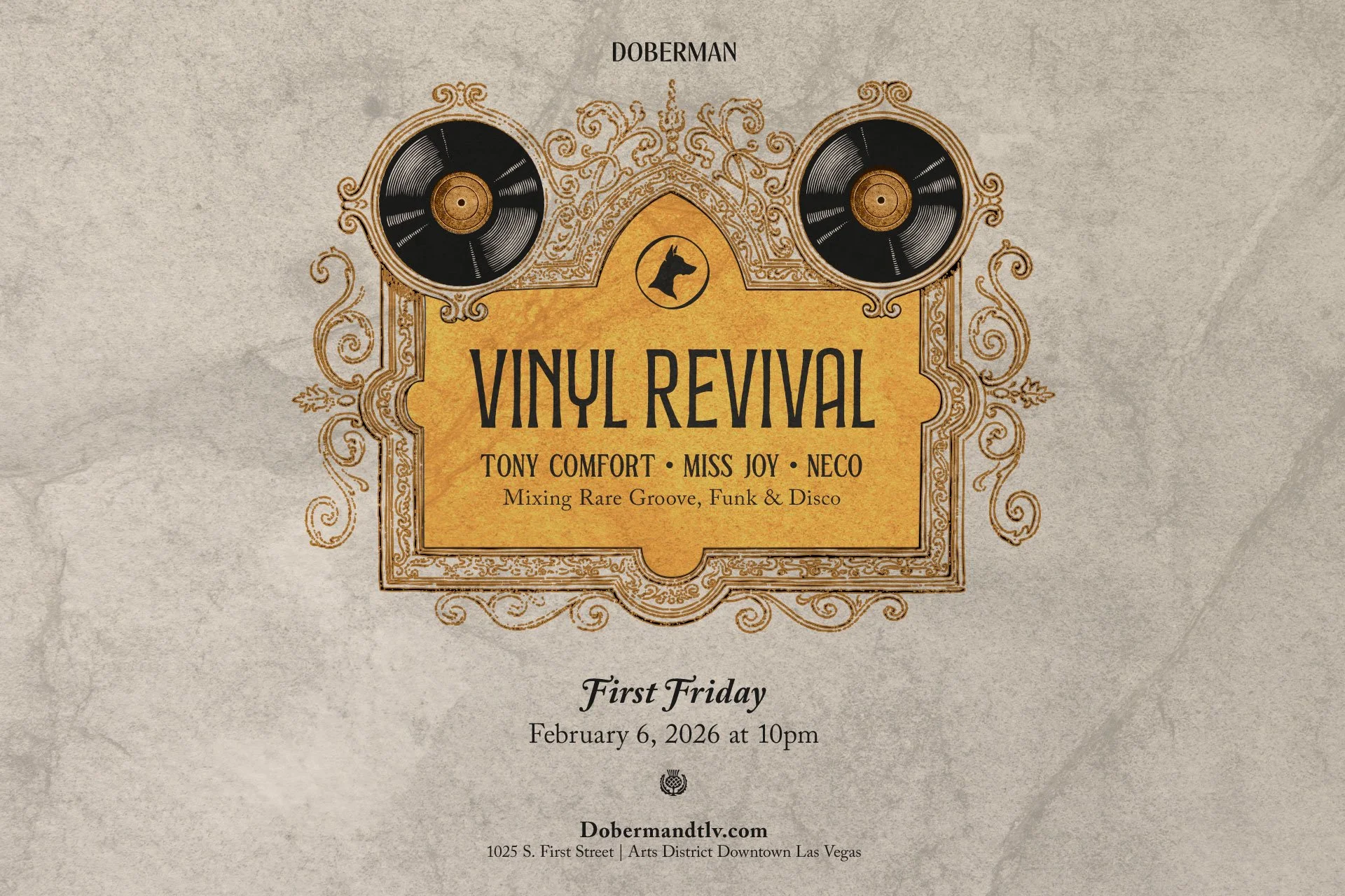 First Friday brings funk and house vinyl from downtown favorites Tony Comfort, Miss Joy, and Neco. Sip, explore, and immerse yourself in the energy of Doberman Drawing Room.