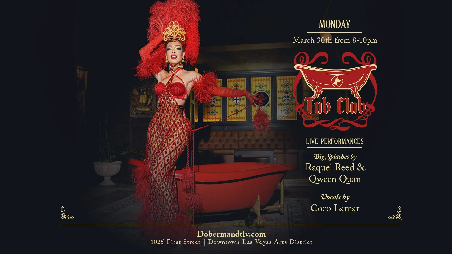 Experience sultry sophistication with classic live music and captivating burlesque — performance by Raquel Reed’s iconic tub act!